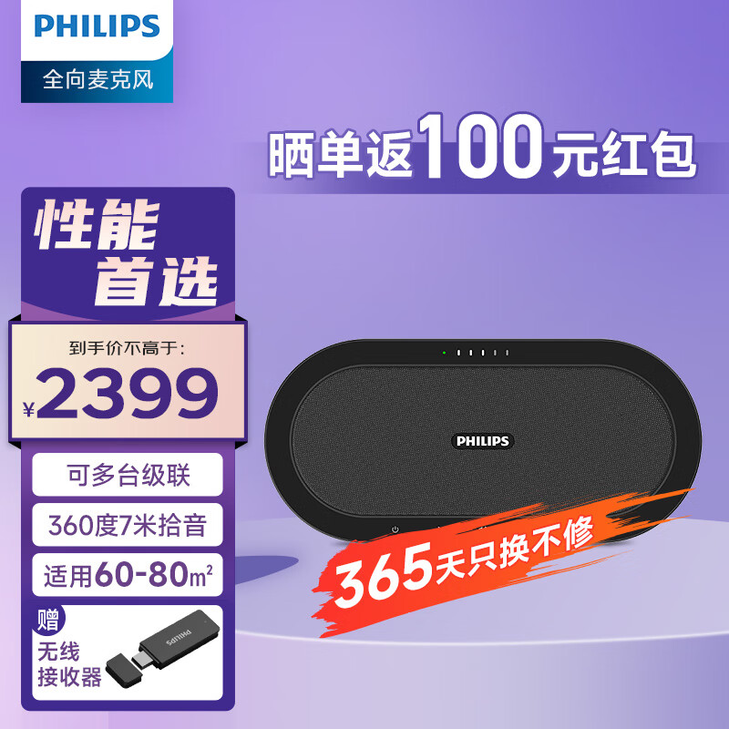飞利浦飞利浦 视频会议全向麦克风 免驱5.8G无线/蓝牙 桌面扬声器 (适用40平米以内会议室)6米拾音扬声器 带电池价格参考: