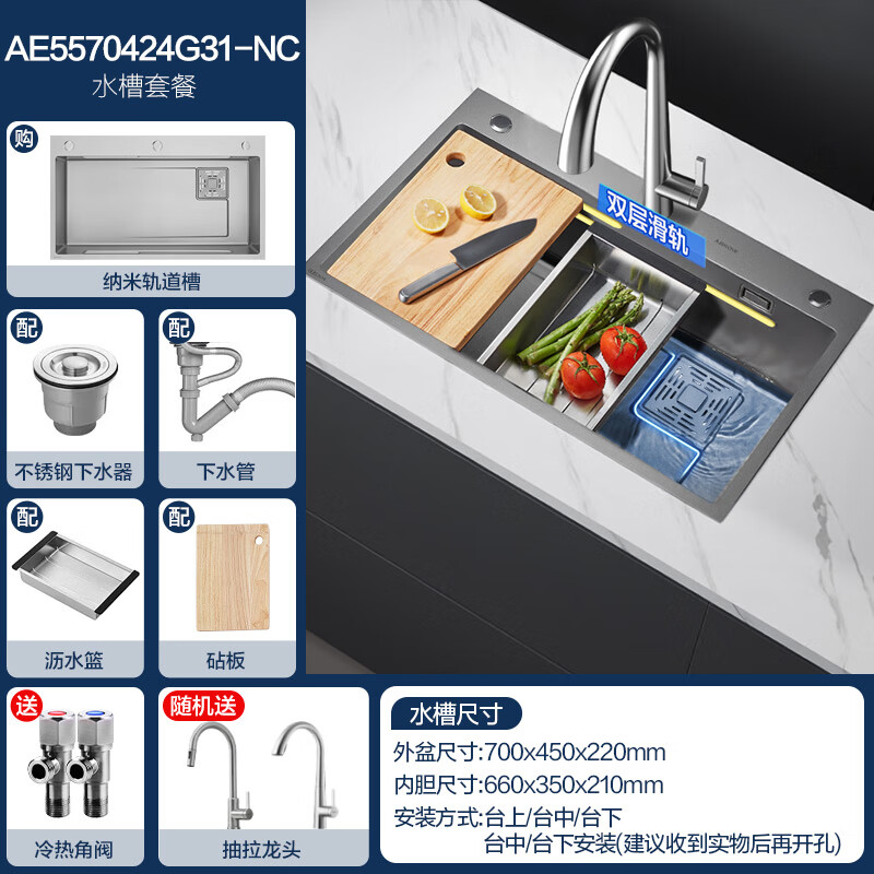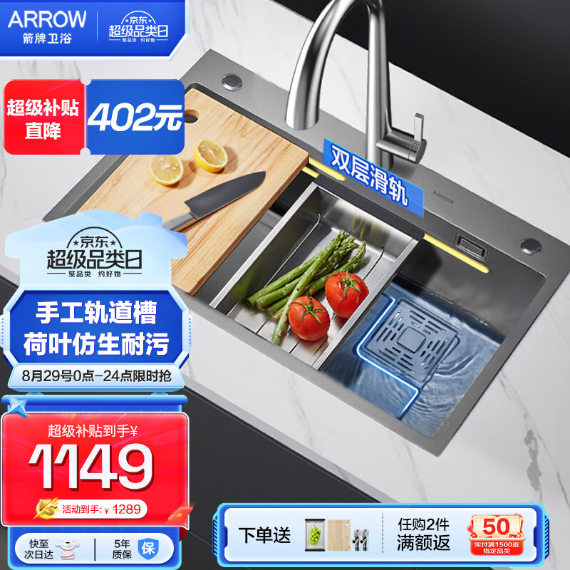 箭牌(ARROW)304不锈钢水槽手工纳米轨道大单槽厨房洗菜盆洗菜池洗碗一体盆 70灰手工纳米轨道槽-含抽拉龙头价格:1551.00元!