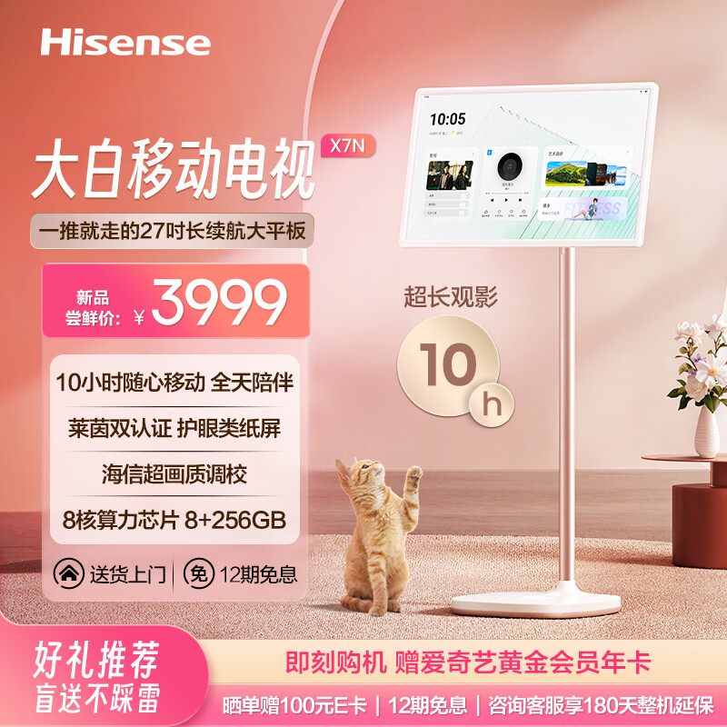 海信大白移动电视 可移动 长续航 护眼类纸屏 娱乐观影多场景 8+256GB 智慧屏27X7N价格:3999.00元!