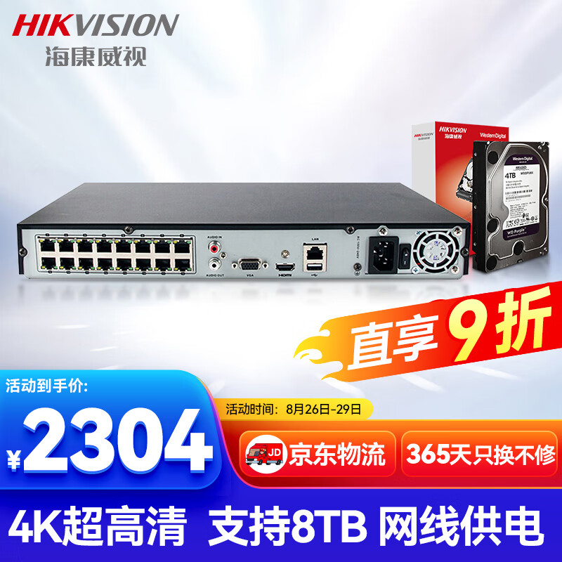 HIKVISION海康威视网络硬盘录像机监控POE网线供电满配16个摄像头带4T硬盘DS-7816N-Q2/16P价格:2594.00元!