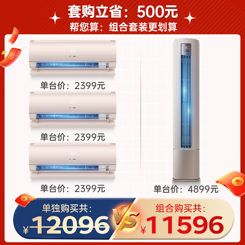 海信(Hisense)健康抑菌空调套装 三室一厅上下分区送风一级能效客厅柜机 卧室家用挂机(1.5匹*3+大3匹)价格:11596.00元!