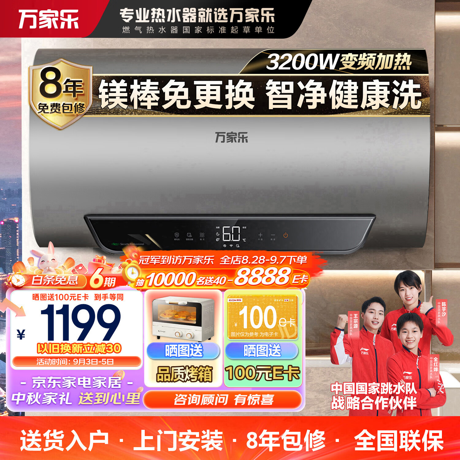 万家乐80升电热水器3200W速热 家用储水式 AI智能灭菌 镁棒免换 出水断电 一级能效D80-FW5 以旧换新价格:1399.00元!