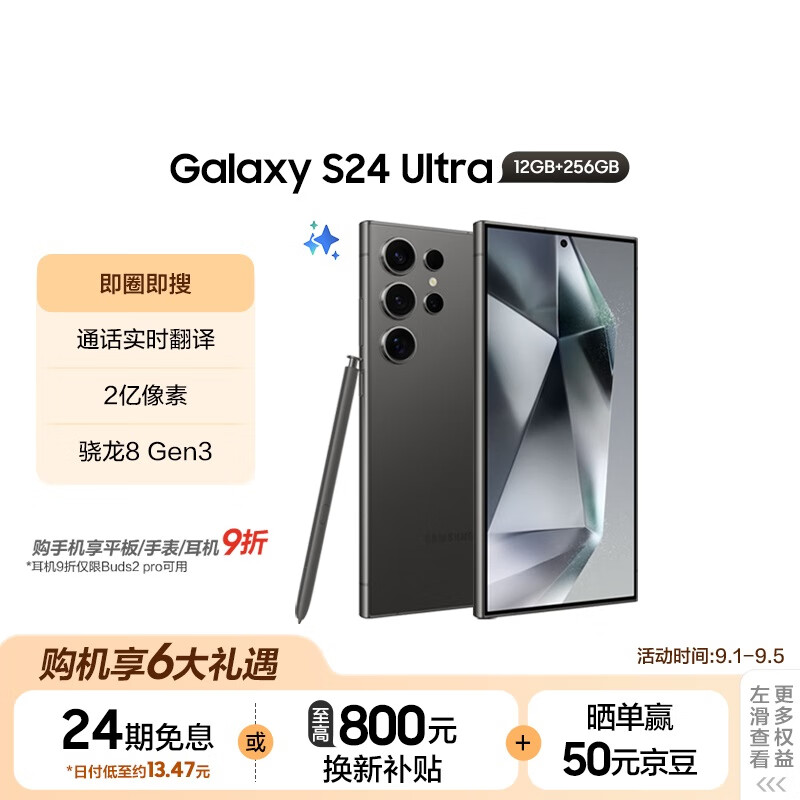 三星(SAMSUNG)Galaxy S24 Ultra AI手机 同声翻译 智能修图 拍照手机 12GB+256GB 钛黑 游戏手机价格:9699.00元!
