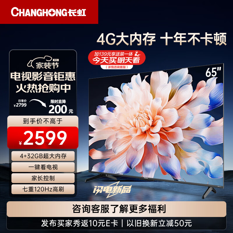 长虹电视65D66F 65英寸4K超高清 4+32GB超大内存 一键看电视 120Hz高刷新液晶电视机 以旧换新价格:2599.00元!