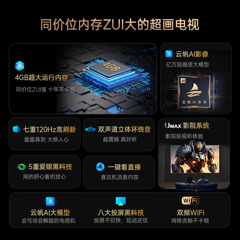 5、确实很牛,配置挺高的,对比其他电视,要么内存小,要么运存小,综合取胜,关键做活动真合适啊,处理器也挺不错,看电视挺清晰,配送员直接安装,挺好的,真大,快一米半了,值了的多看几年。。。。
